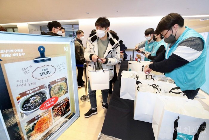 한편 KT는 지난해부터 코로나로 어려움을 겪는 중소상공인을 돕기 위해 사랑의 시리즈를 지속 선보이고 있다. KT는 지난해 3월, 광화문과 우면동 일대 식당에서 만든 도시락을 KT 사옥 구내식당에서 판매하는 ‘사랑의 도시락’ 캠페인을 진행했다. 지난 3월 16일부터 4월 23일까지 광화문 사옥에서 6천개, 우면동 사옥에서 1천 150개, 총 7천 150개의 도시락을 판매했다.