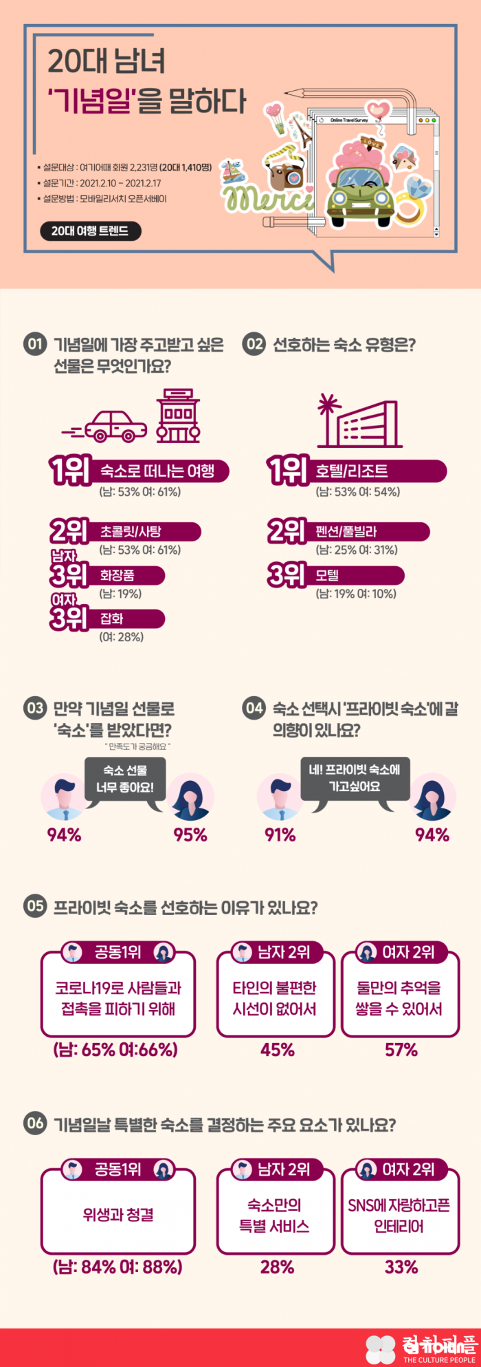 20대 10명 중 9명은 숙소 선택 시 사람들과 독립된 ‘프라이빗 숙소’를 선택할 것이라고 응답했다. 프라이빗 숙소를 선택한 이유는 ‘코로나19로 사람과의 접촉을 피하기 위해서(남 65%, 여 66%)’를 첫손에 꼽았다. 이어 남성은 ‘타인의 불편한 시선이 없어서(45%), 여성은 ‘둘만의 추억을 쌓을 수 있어서(57%)’를 선택했다.