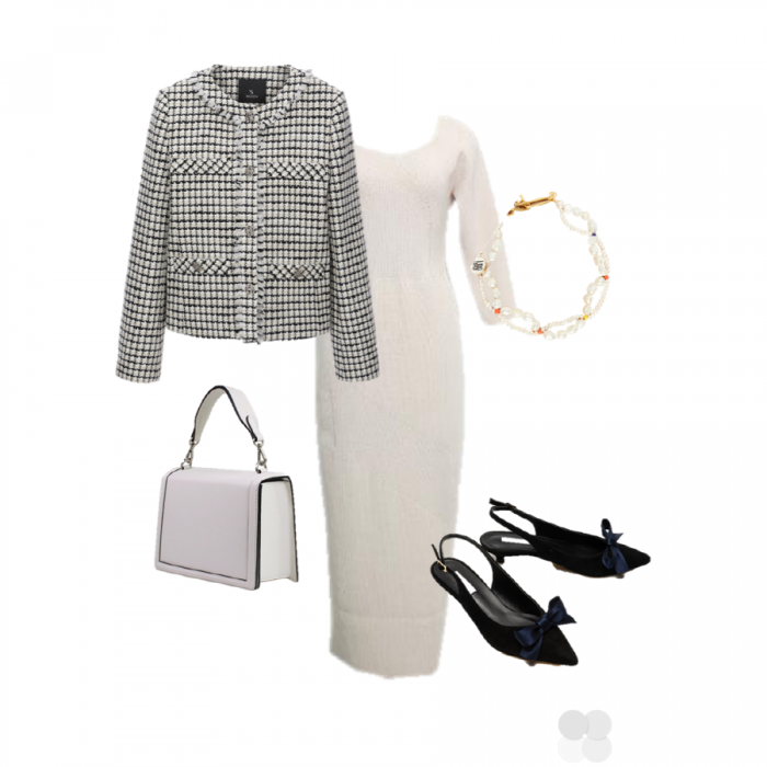 사랑하는 남자친구와 데이트하는 날 미디엄 길이의 원피스와 트위드 재킷을 매치해 보자. 화이트 컬러의 원피스의 깔끔함과 트위드 재킷의 고급스러운 짜임이 더해져 여성스러움이 돋보이는 스타일링이다. 자칫 밋밋해 보일 수 있는 룩에 포인트가 되는 블랙 리본 슬링백을 매치 했다. 진주와 컬러 비즈로 어우러진 목걸이로 넥 라인을 아름답게 보여주며 남자친구에게 더욱 사랑받는 룩을 완성했다.