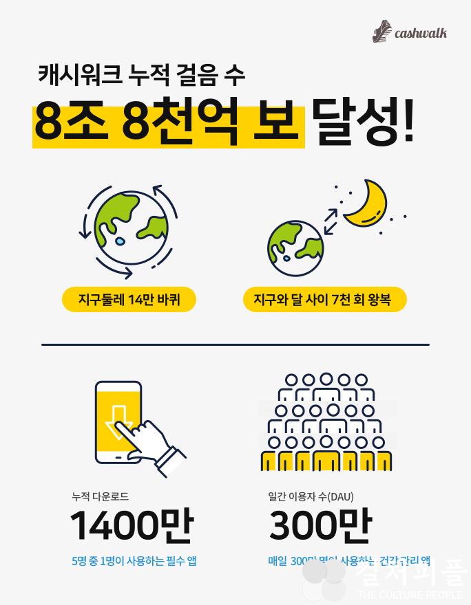 헬시테크 플랫폼 캐시워크㈜가 운영하는 건강 관리 앱 ‘캐시워크’는 이용자들의 누적 걸음 수 8조 8천억 보, 누적 다운로드 수 1,400만 건을 돌파했다고 밝혔다. 누적 걸음 수 8조 8천억 보는 지구 둘레(약 4만km)를 14만 바퀴, 지구와 달 사이(약 40만km)를 7천 회 이상 왕복 가능한 수치이다.