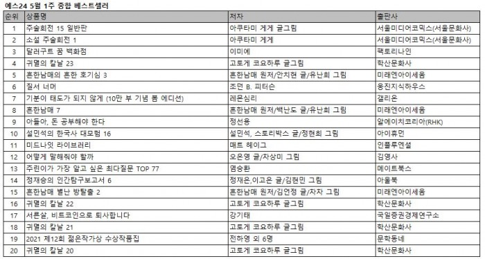 예스24 5월 1주 종합 베스트셀러에서는 일본 인기 SF 판타지 만화 시리즈 <주술회전 15 일반판>과 <소설 주술회전 1>이 예약판매와 동시에 각각 1위와 2위에 새롭게 등극했다. 이어 어른을 위한 힐링 판타지 소설 <달러구트 꿈 백화점>이 한 계단 하락해 3위에 올랐고, 지난주 1위였던 인기 만화 시리즈 마지막화 <귀멸의 칼날 23>이 세 계단 하락한 4위, 인기 유튜브 크리에이터 ‘흔한남매’의 과학 학습 만화 <흔한남매의 흔한 호기심 3>이 5위에 올랐다.