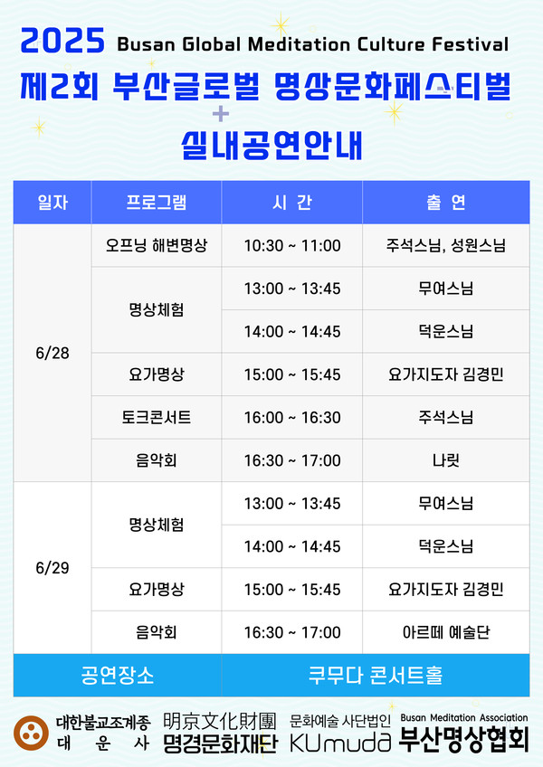무엇보다 페스티벌에서는 일상 속에서 누구나 쉽게 접할 수 있는 생활 명상을 비롯해 명상 지도자들의 다양한 명상법이 소개된다. 행사는 28일 오전10시30분 부산명상협회 회장 주석 스님과 성원 스님이 함께하는 오프닝 해변명상으로 시작을 알린다. 이어 양일간 쿠무다 콘서트홀에서는 다채로운 명상 문화의 향연이 마련된다.