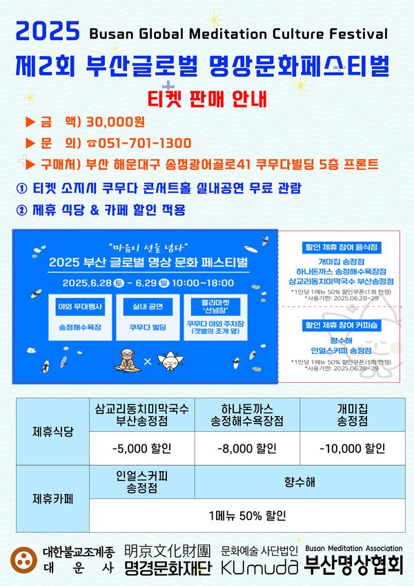부산명상협회, 6월28~29일 양일간 개최 대운사·명경문화재단·쿠무다·부산서핑협 공동 ‘마음이 선을 넘다’ 주제 명상 대중화 목표 쿠무다 이사장 주석 스님 등 명상 지도 주목 시민·관광객 누구나 자유롭게 동참 가능 지역 상권 연계 할인 티켓…플리마켓도 부산명상협회(BMA)는 부