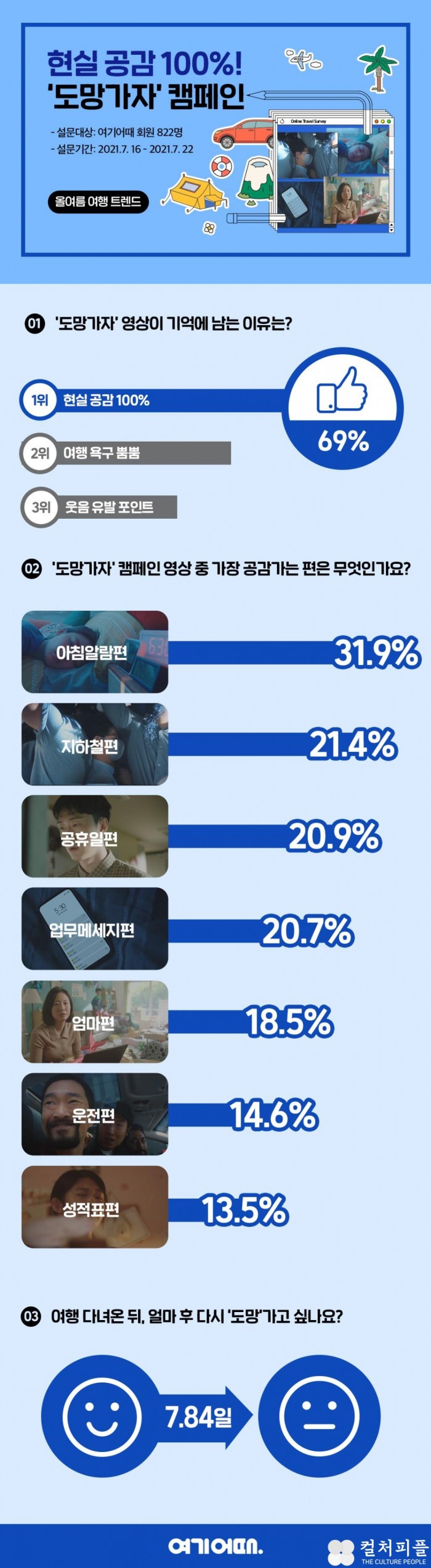 설문조사 응답자는 가장 공감되는 영상으로 ‘아침 알람 편(31.9%)’을 꼽았다. ‘지하철 편’, ‘업무 메시지 편’은 각각 21.4%, 20.9%가 선택했다. 응답자들은 또한, 여행으로 회복한 에너지는 평균 7.84일간 유지되며, 2.4개월에 1회는 '도망 여행'을 떠나고 싶다고 답했다.