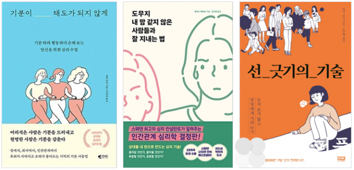 회사에서 기분과 감정을 잘 다스리지 못하는 사람들에게 후회와 오해를 줄이는 기분 사용법을 제시한 <기분이 태도가 되지 않게>는 작년 6월 출간 이후 현재까지도 종합 베스트셀러에 올라 있다. 스웨덴 심리 컨설턴트 토마스 에릭손의 사회생활 심리학 <도무지 내 맘 같지 않은 사람들과 잘 지내는 법>은 성격 유형별 대응법을 제시하며 문제 해결을 돕는다. 나 중심의 선택을 강조하는 <선 긋기의 기술>은 직장 내에서 알맞은 거리를 지키는 방법을 구체적으로 알려 준다.