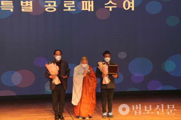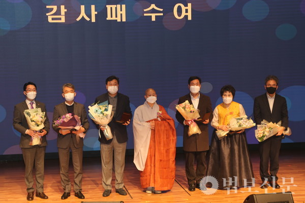 이어 백용기 거봉그룹 회장, 이홍헌 더 대운 회장, 이오상 KNN 대표이사, 권경진 동원제일저축은행 대표, 박상영 BNK부산은행 두실지점장, 우기상 KEB하나은행 사상지점장, 장유정 사단법인 미소원 이사장, 유재우 에스이테크컨설팅 대표, 유숙희 씨, 고(故) 박연차 회장 유족, BBS부산불교방송에는 각각 감사패가 전달됐다. 특별 공로패는 불사의 원만 회향에 열정을 다한 차재돈 쿠무다 사무국장, 이용훈 디자인팀장이 각각 수상했다.