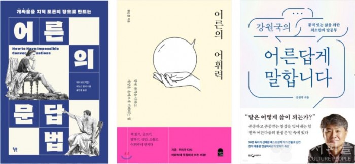 성숙하고 지적인 대화를 위해 실용적이면서도 철학적인 가이드라인과 품위있는 문답법을 제시하는 <어른의 문답법>은 지난 9월 출간된 직후부터 인문 분야 베스트셀러 상위 10위권에 지속적으로 머무르며 인기다. 낱말에 대해 잘 아는 것의 중요성과 익숙한 어휘를 정확하게 사용하는 법을 전하는 <어른의 어휘력> 역시 스테디셀러다. 인기 도서 <대통령의 글쓰기> 저자 강원국 작가의 또 다른 책 <강원국의 어른답게 말합니다>는 진짜 어른다움을 완성하는 말하기 방법을 이야기하며 독자들의 사랑을 받고 있다.