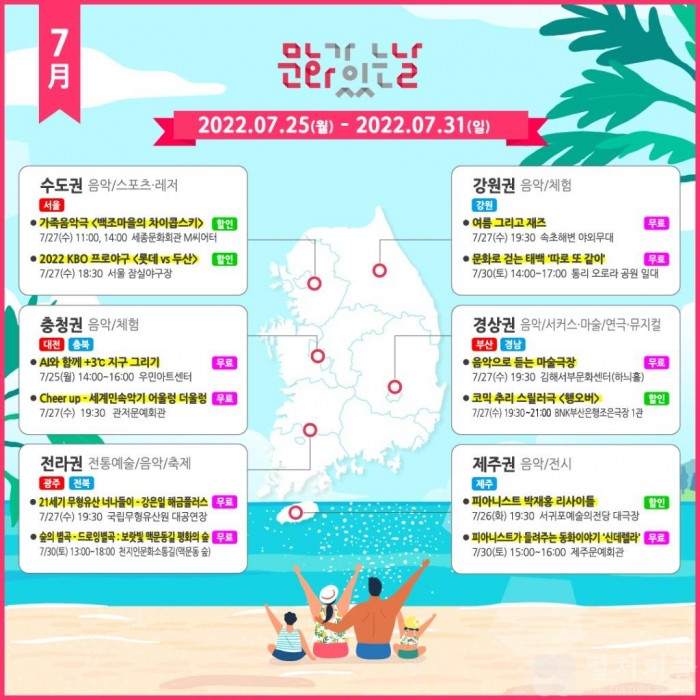 문화체육관광부(장관 박보균)와 지역문화진흥원(원장 차재근)은 7월 ‘문화가 있는 날’ 주간(7.25~7.31)에 국민들이 일상에서 더욱 쉽게 문화를 접할 수 있도록 다양한 문화 혜택을 제공한다.