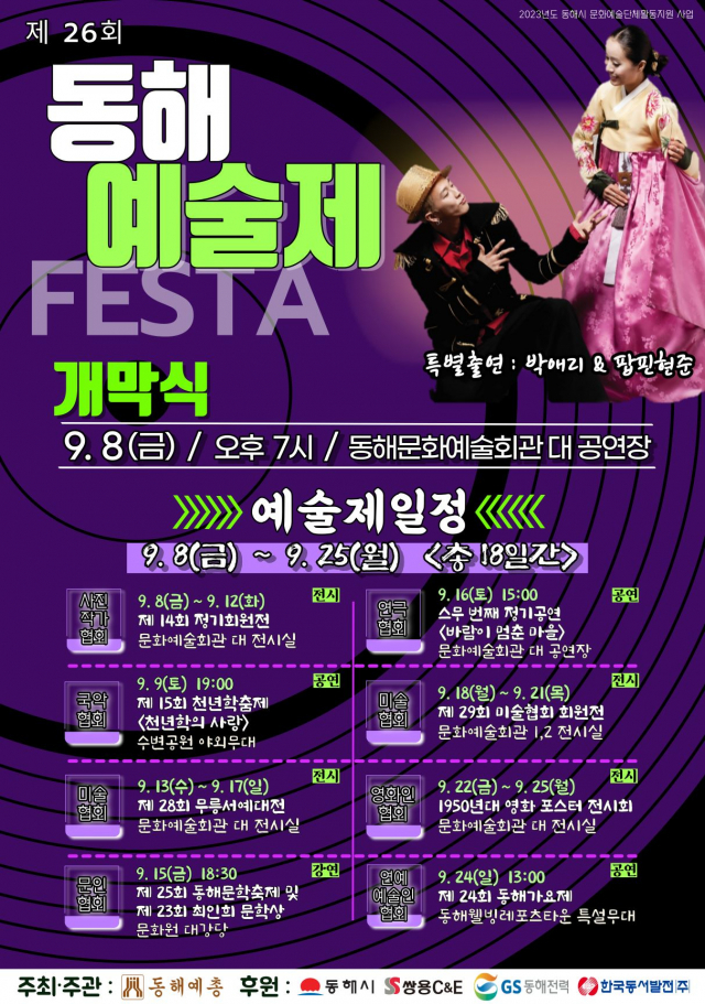 동해예총이 주최·주관하고 동해시, 쌍용C&E, GS동해전력, 한국동서발전(주)가 후원하는 제26회 동해예술제 개막식은 8일 오후 7시 동해문화예술회관 대공연장에서 열린다.