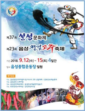 음성군의 대표 축제인 설성문화제와 청결고추축제가 12일부터 15일까지 음성종합운동장 일원에서 4일간 열린다. 충청북도민속예술축제와 음성 민속예술 한마당 놀이 프로그램, 청결고추 홍보 등 다채로운 행사가 진행될 예정이다.