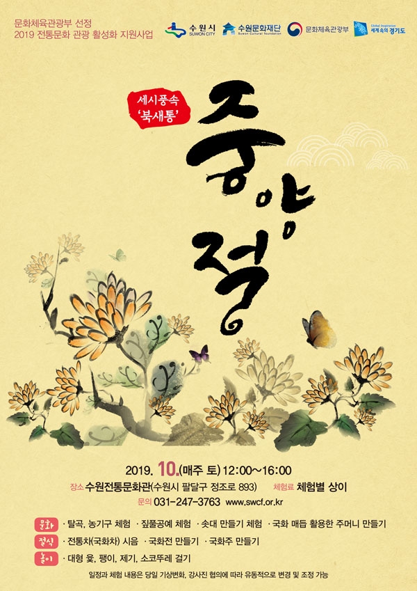 수원전통문화관이 10월 한 달간 매주 토요일, 중양절을 맞아 다채로운 세시풍속 체험 행사를 진행한다. 국화주 시음, 수유 주머니 만들기 등 전통 문화를 즐길 기회다.