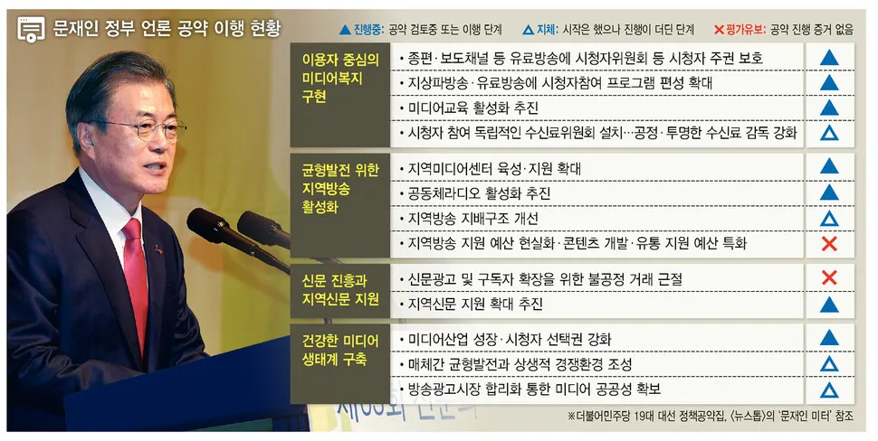 문재인 정부 2년간의 언론 정책에 대한 비판적 평가가 제기되며, 언론계와 시민단체들은 미디어 환경 변화에 발맞춘 새로운 논의 기구 구성을 촉구하고 있습니다. 공약 이행률 저조와 미디어 생태계 변화에 대한 대응 부족이 주요 쟁점으로 떠오르고 있습니다.